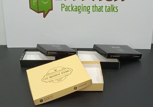 Nous concevons vos boîtes, lunch box, sachets et coffrets sur mesure, imprimés avec votre logo, vos couleurs ou même des finitions dorées.